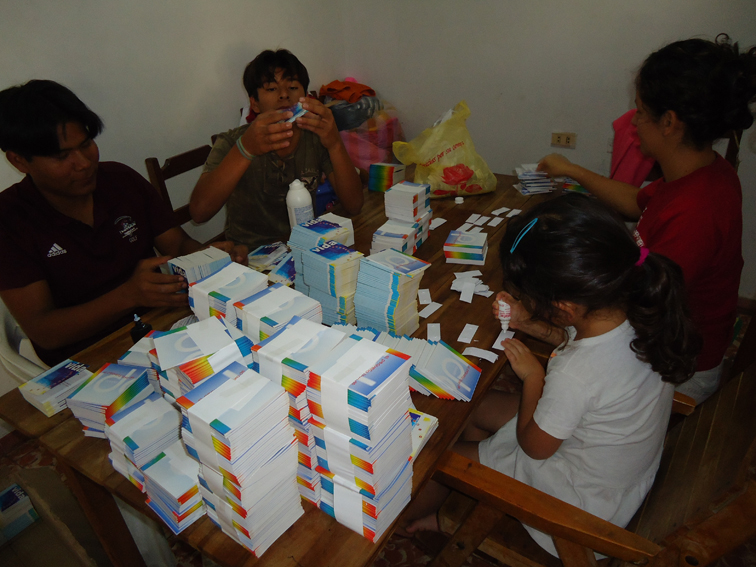 Bom, enquanto tomamos nosso tereré, David e seu irmão Rolando estão carimbando os folhetos para o evangelismo da tarde.